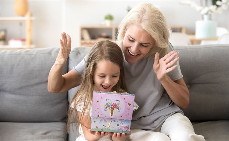 - De kist kan aan de achterkant opengetrokken worden om een lief deuntje te spelen en het kleine eenhoorn draait rond.