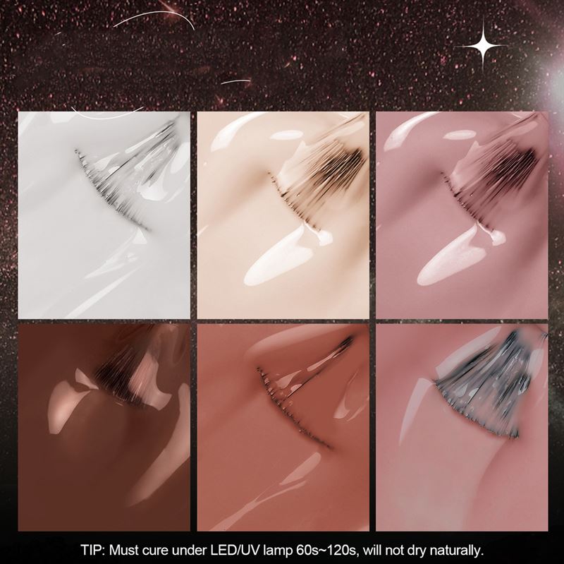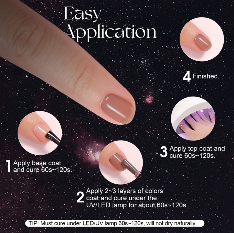 Toepassing en gebruik: Begin met het vijlen van het nageloppervlak, breng vervolgens een basislaag aan, kies je favoriete kleur uit de set en werk af met een toplaag. Vergeet niet elke laag 60 tot 120 seconden uit te harden onder een UV/LED-lamp voor optimale duurzaamheid.